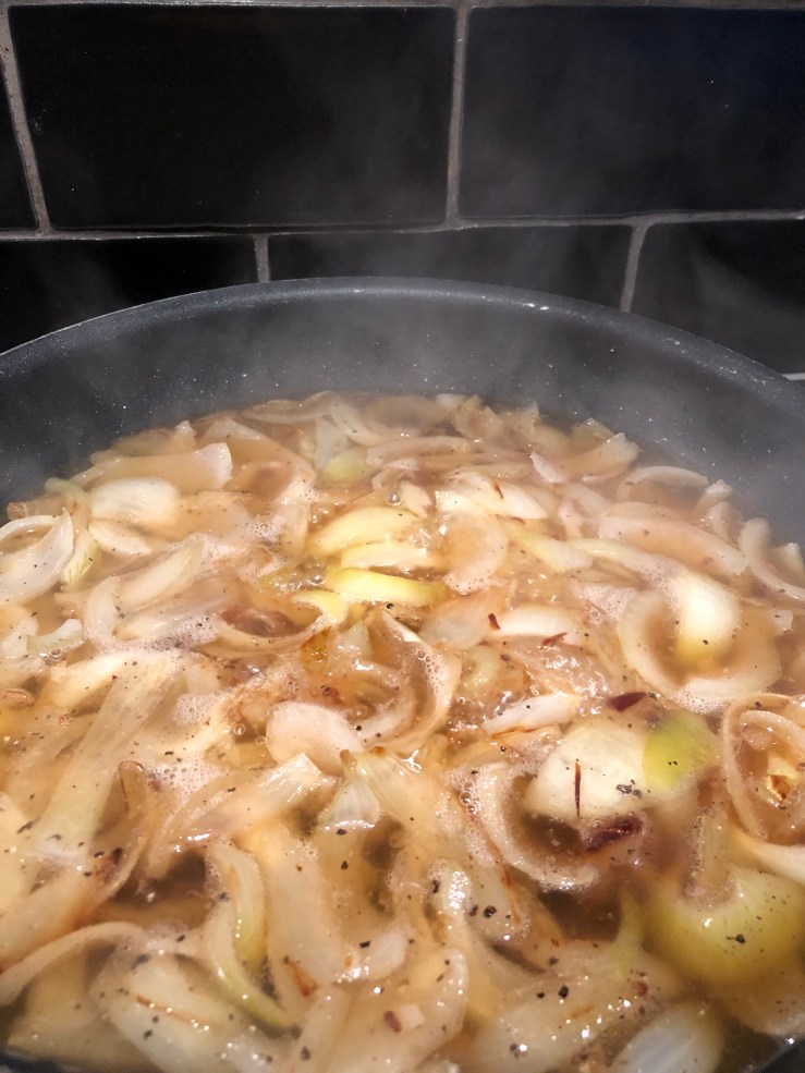 Söndag och kvällens meny ser ut som följande: till förrätt lagar Fredrik en löksoppa som just nu puttrar i stekpannan.