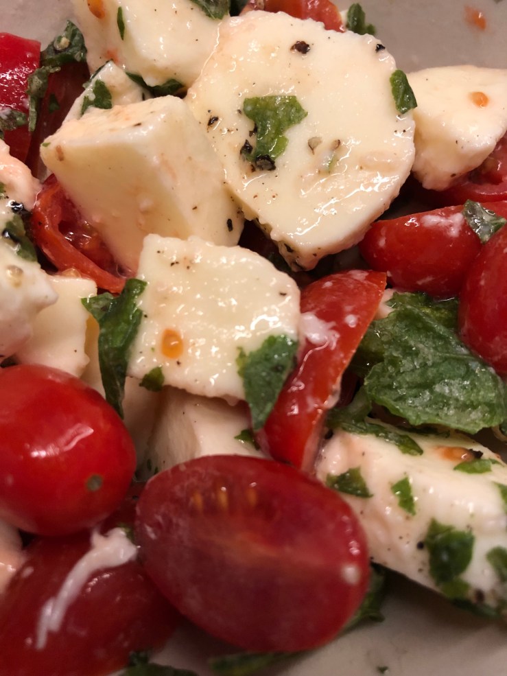 En andra förrätt blir en Insalata Caprese med svensk mozzarella, från Frägsta Mejeri i Hälsingland, ihop med vår egen basilika. Och såklart tomat, salt, peppar och olja.